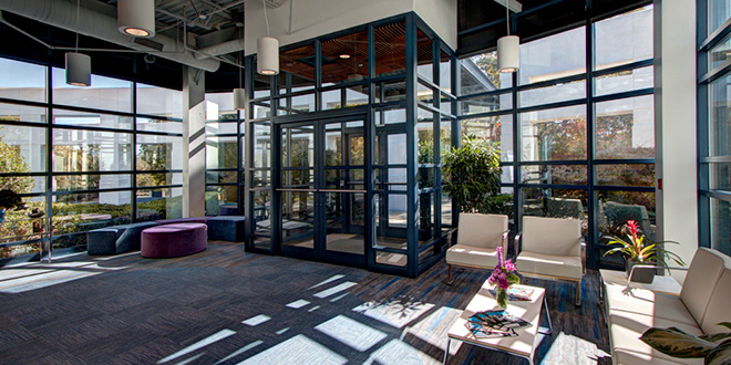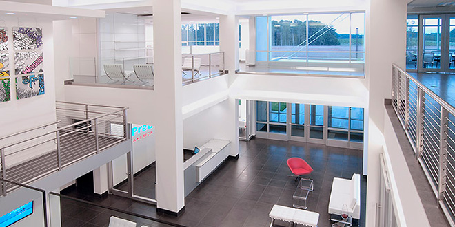 The office portion features a large atrium lobby complete with a cantilever monumental stair and café gelato bar. The third floor of the office component features approximately 9,000 SF for residential use. It includes four efficiency apartments complete with kitchenettes, bedrooms and balconies for extended stay guests from the home office in Italy. The design of the entire facility features contemporary clean lines and an open plan. The combination of materials; concrete, glass, stainless steel, porcelain tile, and crisp white walls compliment the modern design intent.