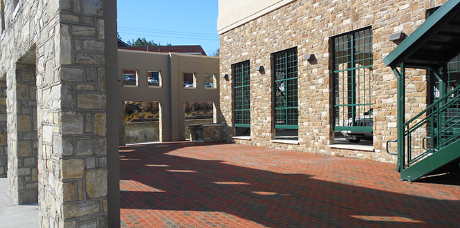 The existing building on the site was demolished due to floodway issues, and salvaged stone from the existing Depot building was reused to create a screen wall around a new plaza area fronting Rivers and Depot Streets which depicts the historic Depot Building once on the site.
